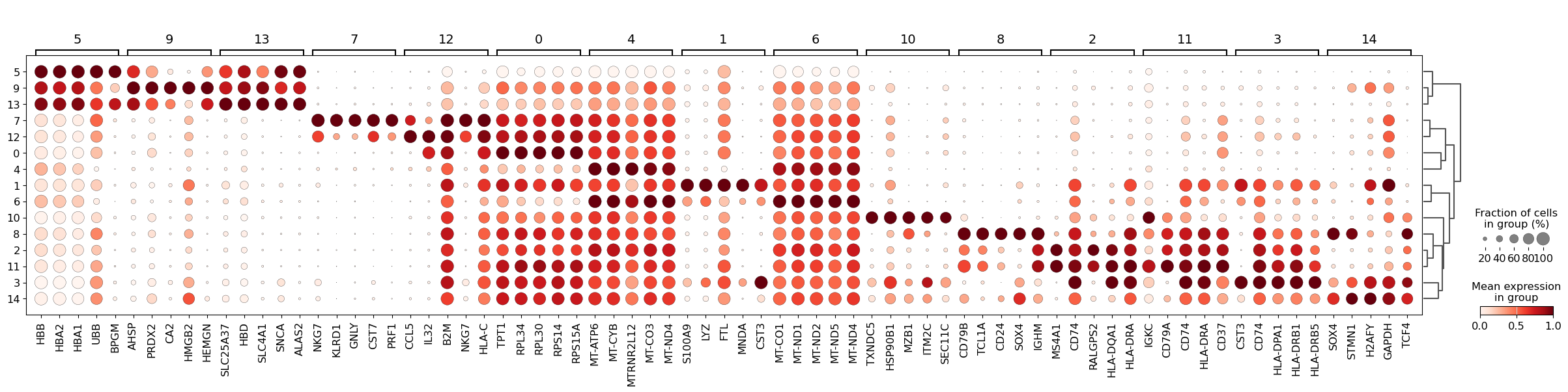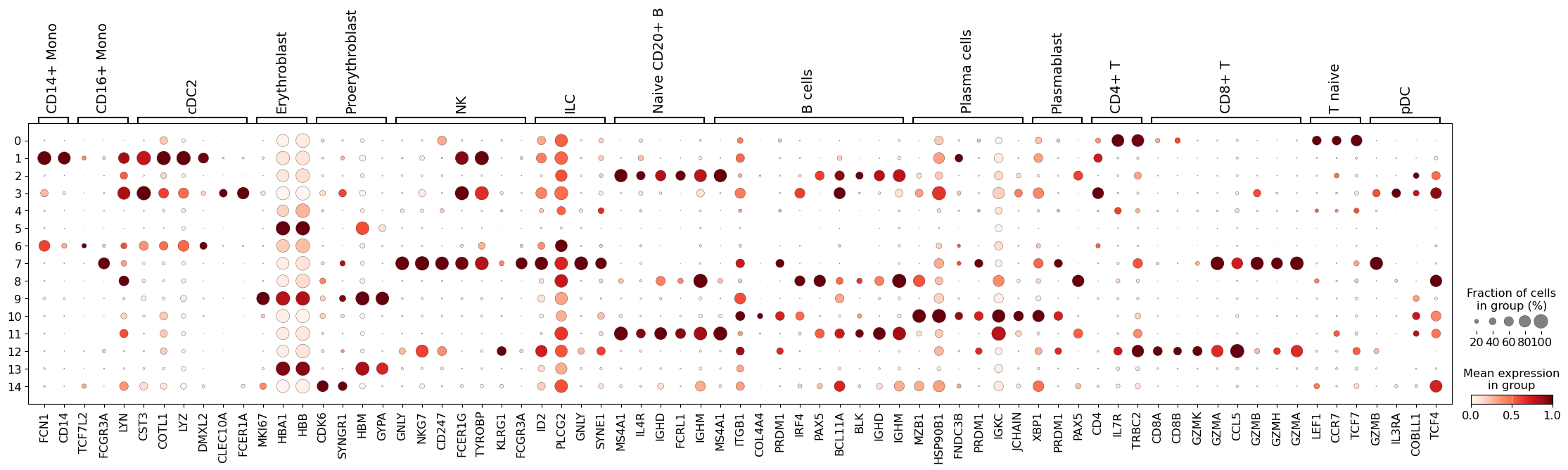 This seems like a resolution that suitable to distinguish most of the different cell types in our data. As such, let’s try to annotate those by manually using the dotplot above, together with the UMAP of our clusters. Ideally, one would also look specifically into each cluster, and attempt to subcluster those if required.