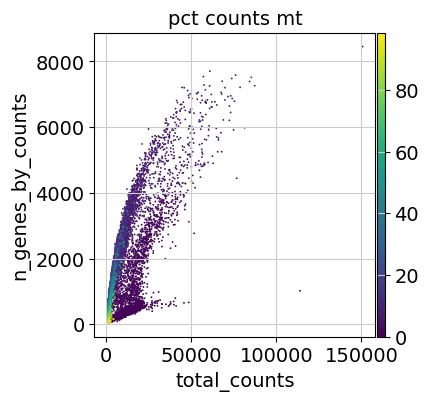 Additionally, it is useful to consider QC metrics jointly by inspecting a scatter plot colored by pct_counts_mt