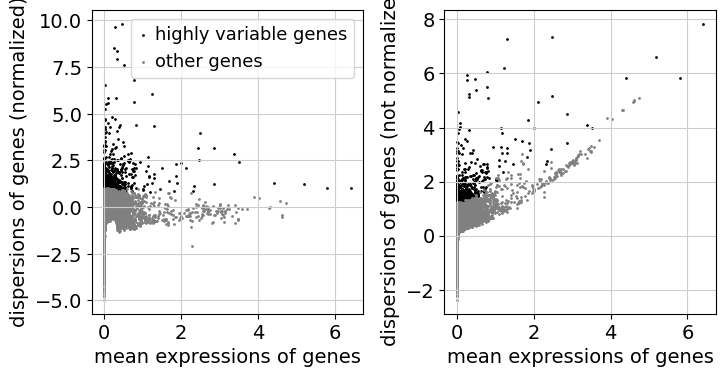 As a next step, we want to reduce the dimensionality of the dataset and only include the most informative genes. This step is commonly known as feature selection. The scanpy function pp.highly_variable_genes