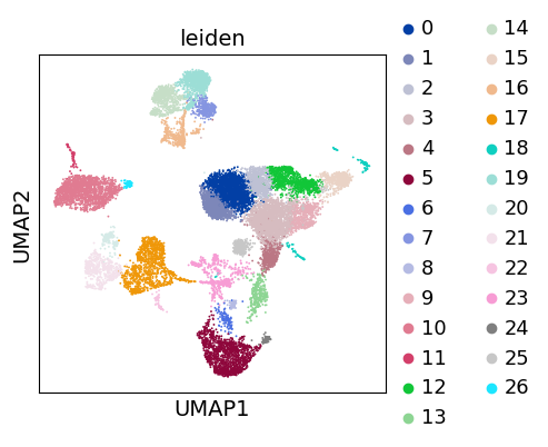 As with Seurat and many other frameworks, we recommend the Leiden graph-clustering method (community detection based on optimizing modularity) [Traag et al., 2019]. Note that Leiden clustering directly clusters the neighborhood graph of cells, which we already computed in the previous section.