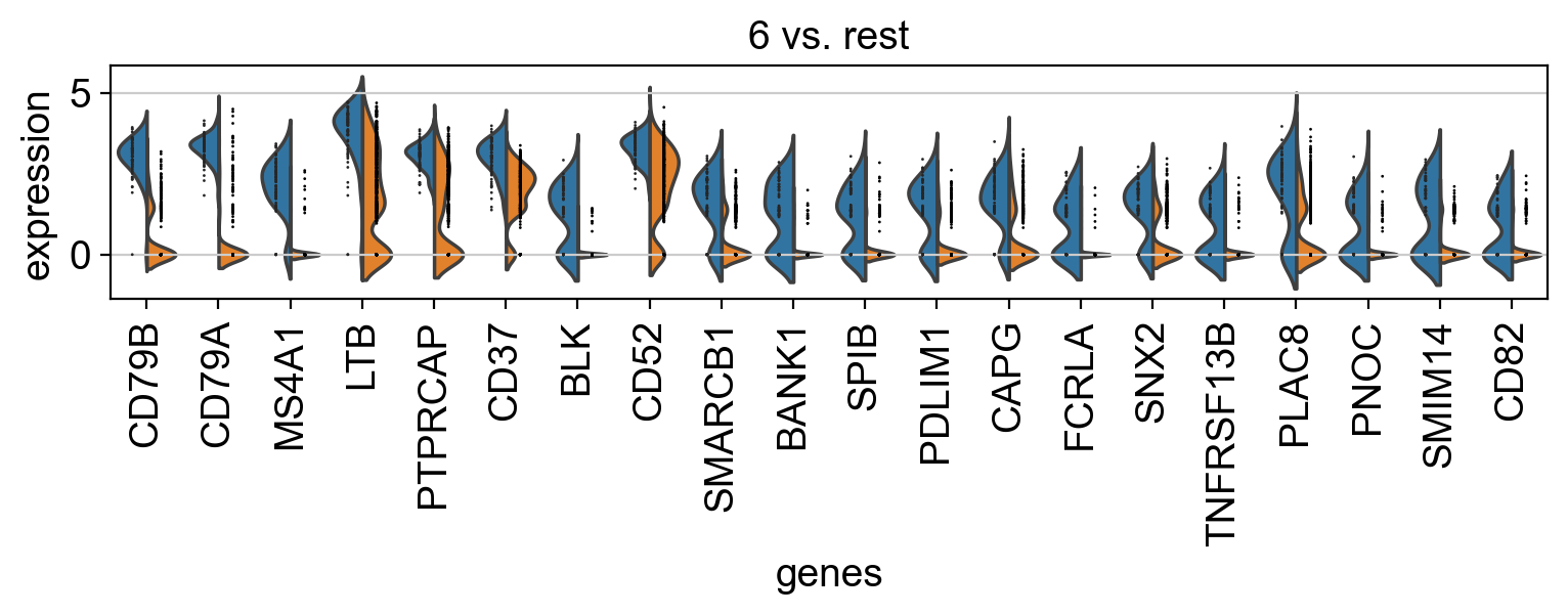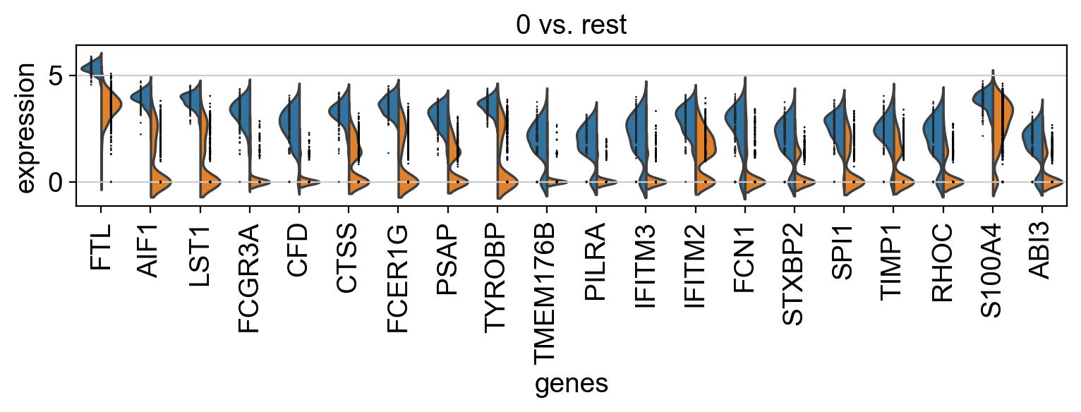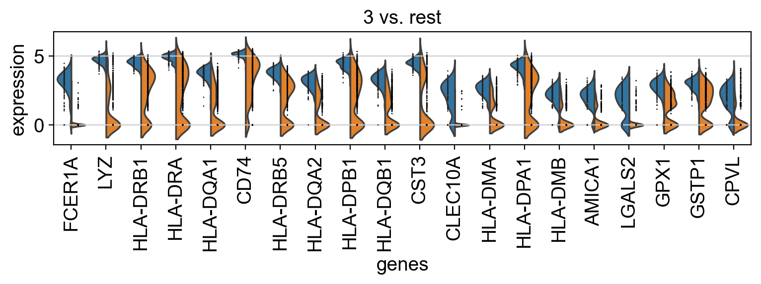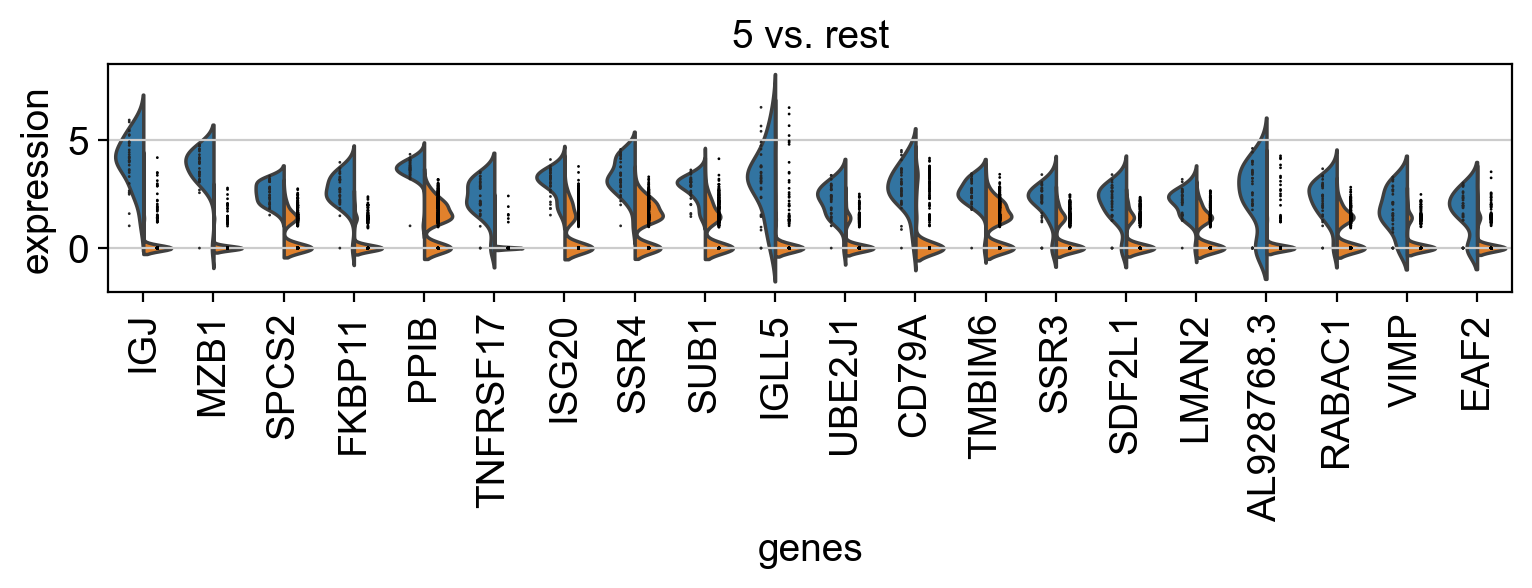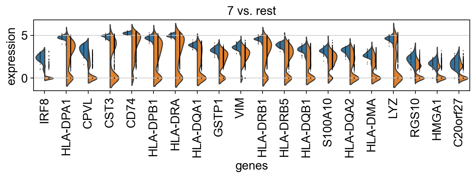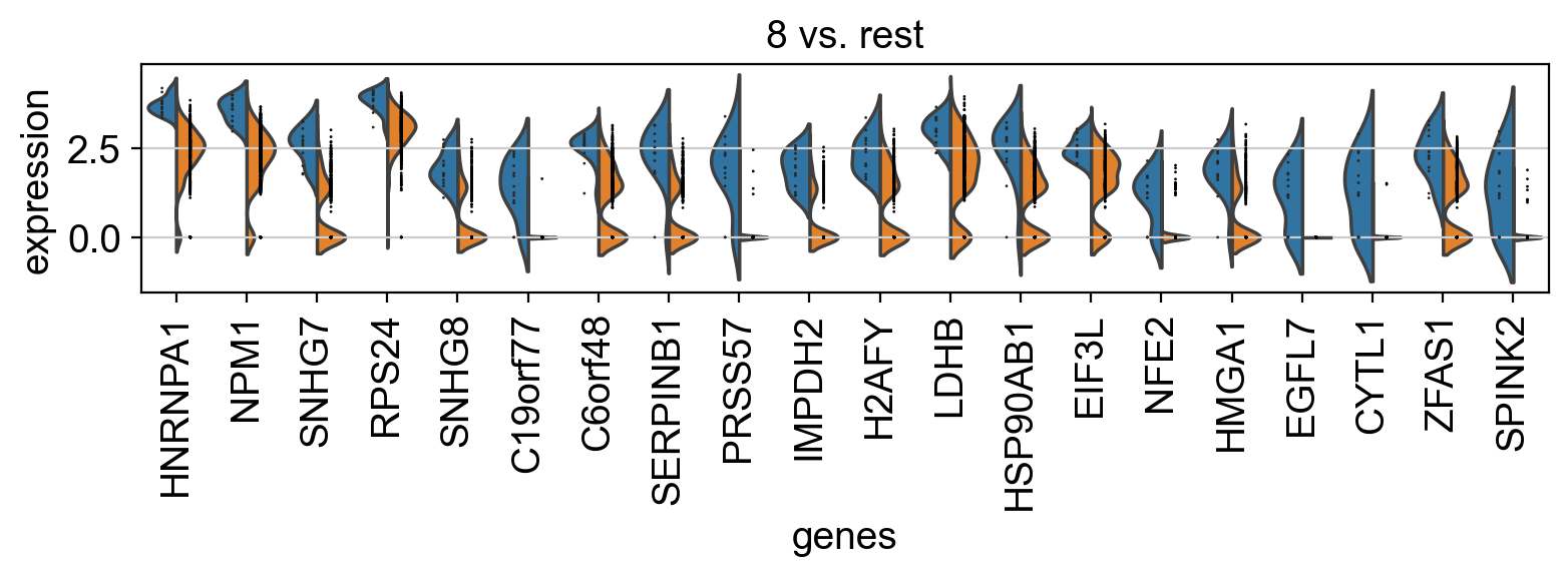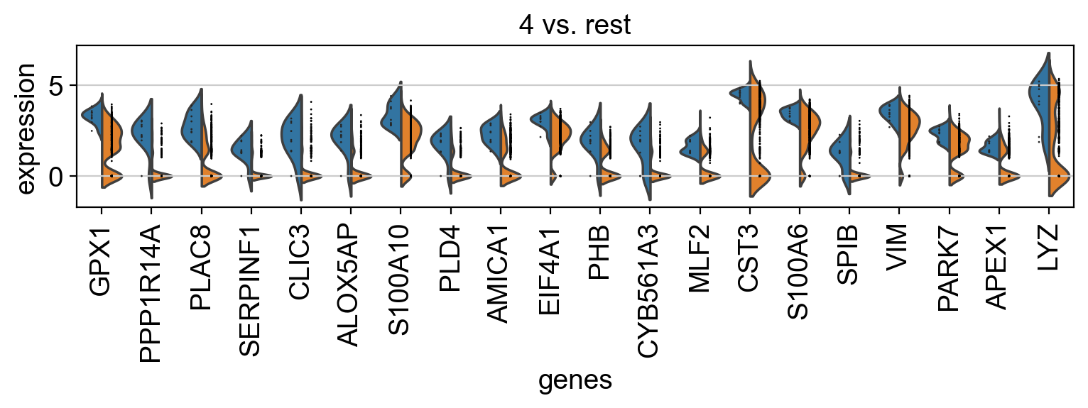 In scanpy, is very easy to compare marker genes using split violin plots for all groups at once.