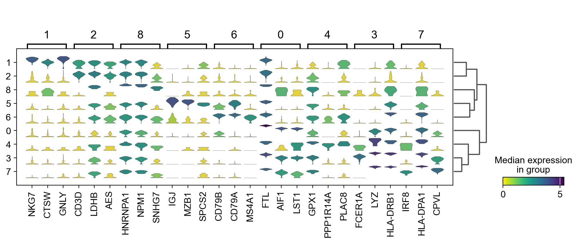 To simultaneously look at the violin plots for all marker genes we use sc.pl.stacked_violin