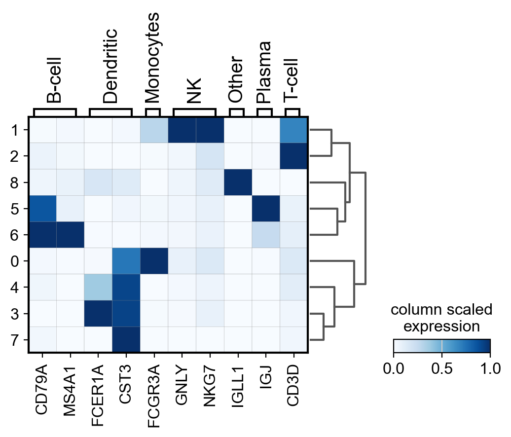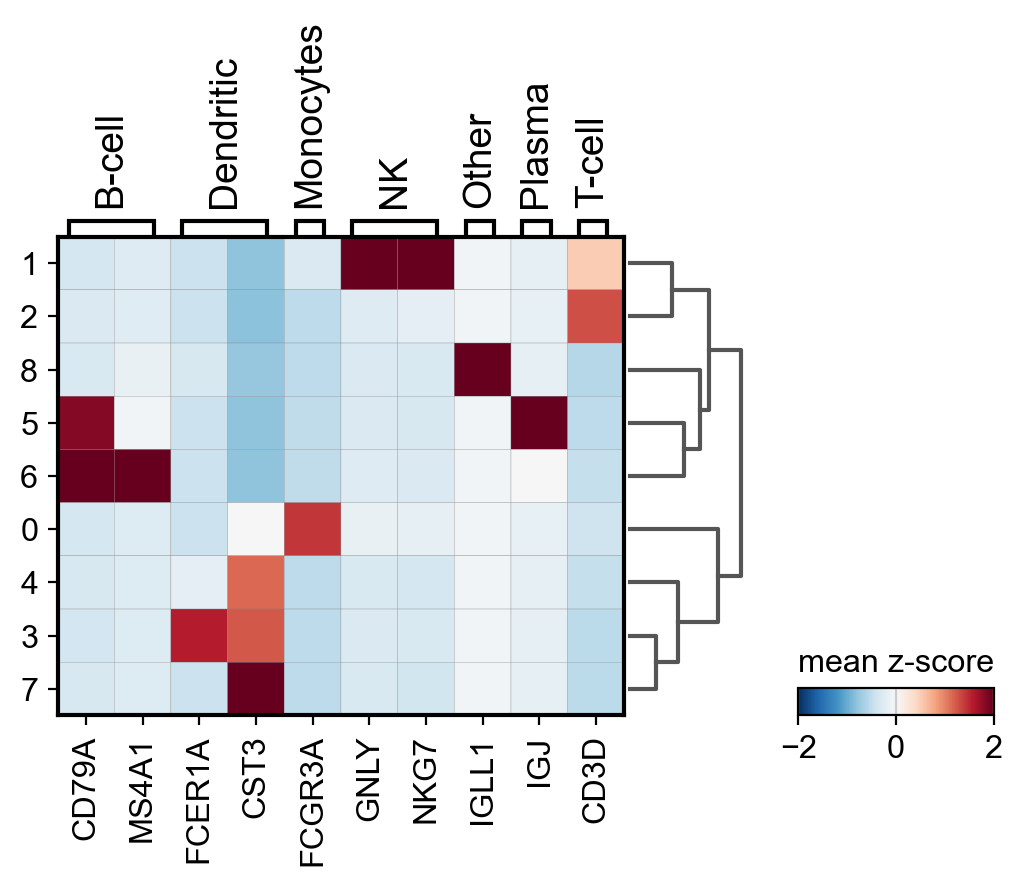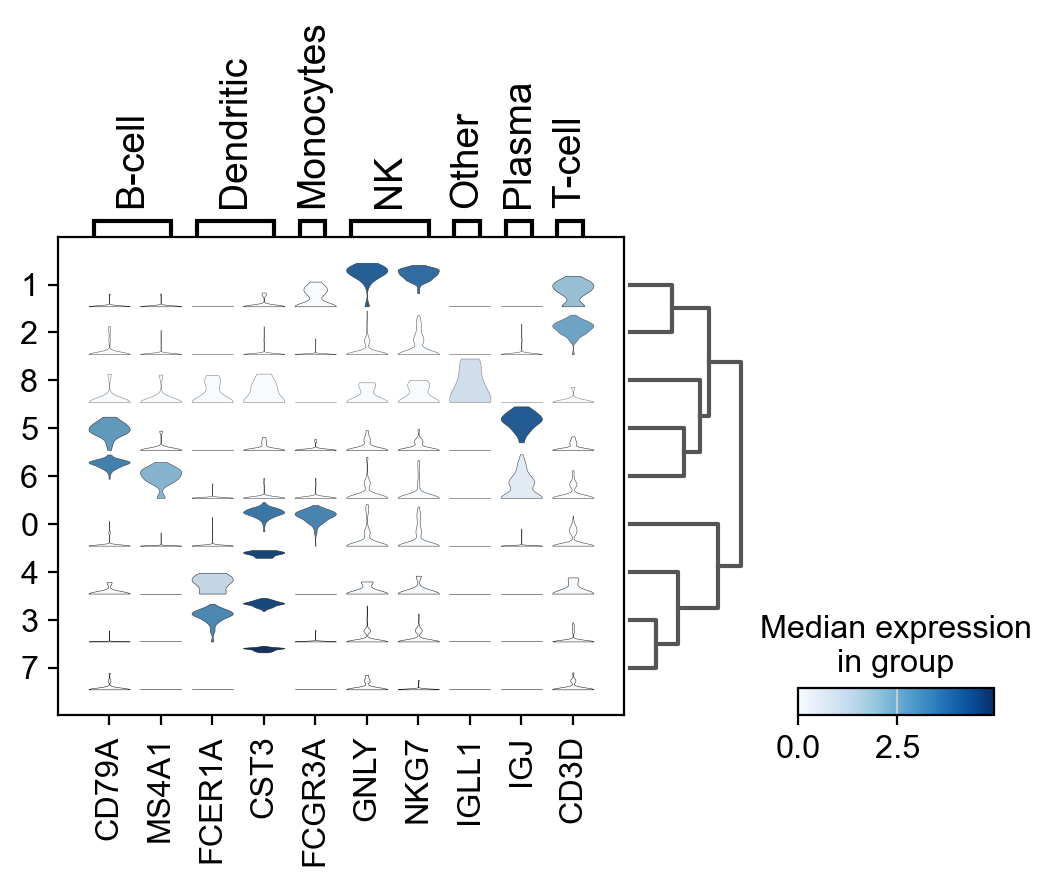 Frequently, clusters need to be labelled using well known marker genes. Using scatter plots we can see the expression of a gene and perhaps associate it with a cluster. Here, we will show other visual ways to associate marker genes to clusters using dotplots, violin plots, heatmaps and something that we call ‘tracksplot’. All of these visualizations summarize the same information, expression split by cluster, and the selection of the best results is left to the investigator do decide.
