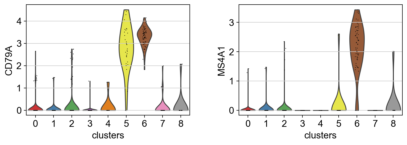 A different way to explore the markers is with violin plots. Here we can see the expression of CD79A in clusters 5 and 8, and MS4A1 in cluster 5.Compared to a dotplot, the violin plot gives us and idea of the distribution of gene expression values across cells.