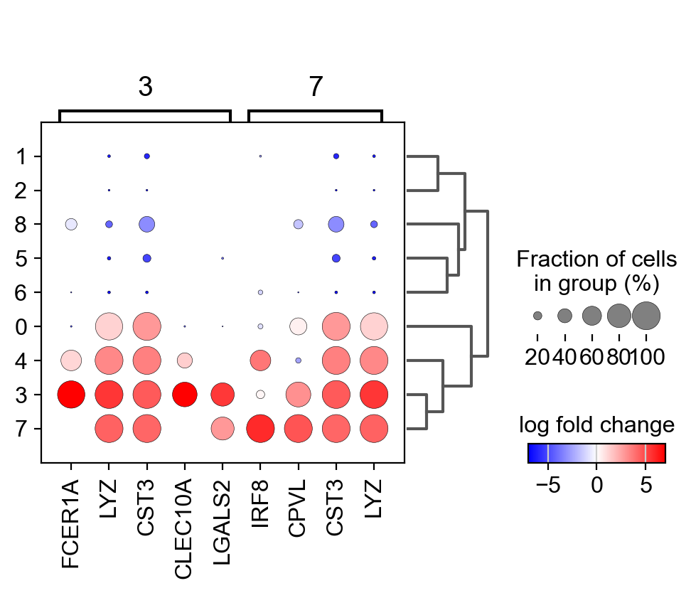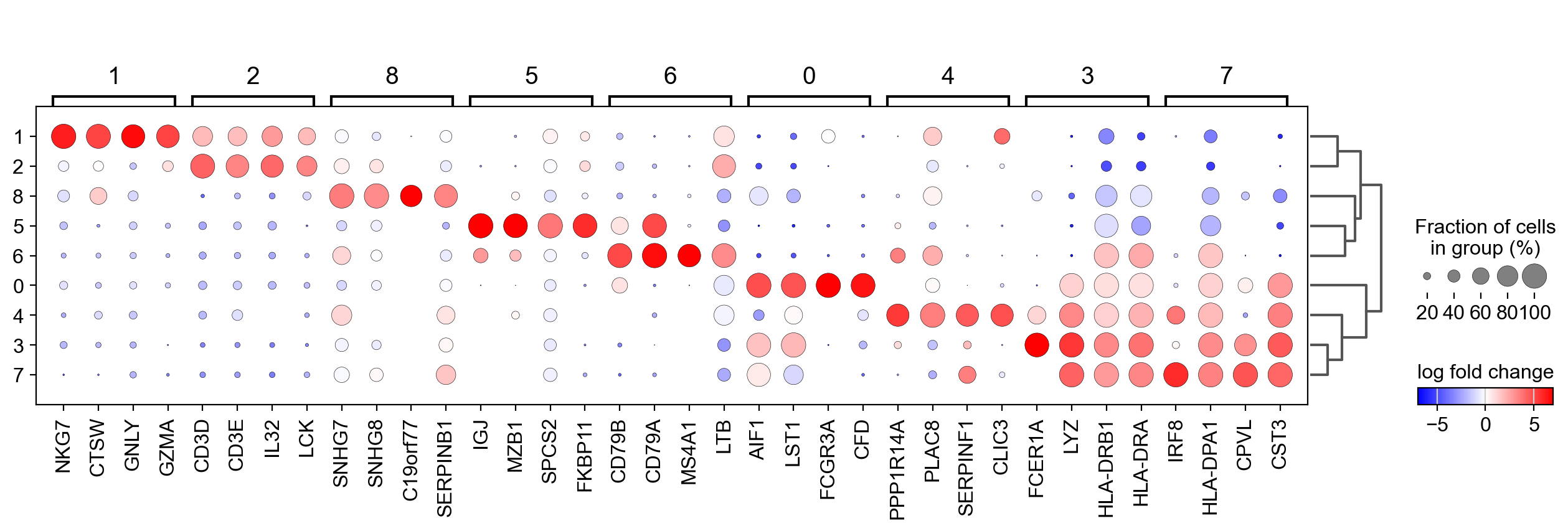 The dotplot visualization is useful to get an overview of the genes that show differential expression. To make the resulting image more compact we will use n_genes=4