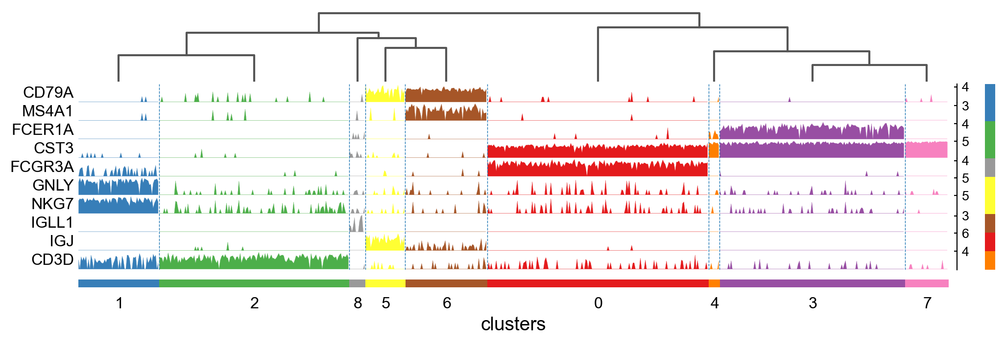 The track plot shows the same information as the heatmap, but, instead of a color scale, the gene expression is represented by height.