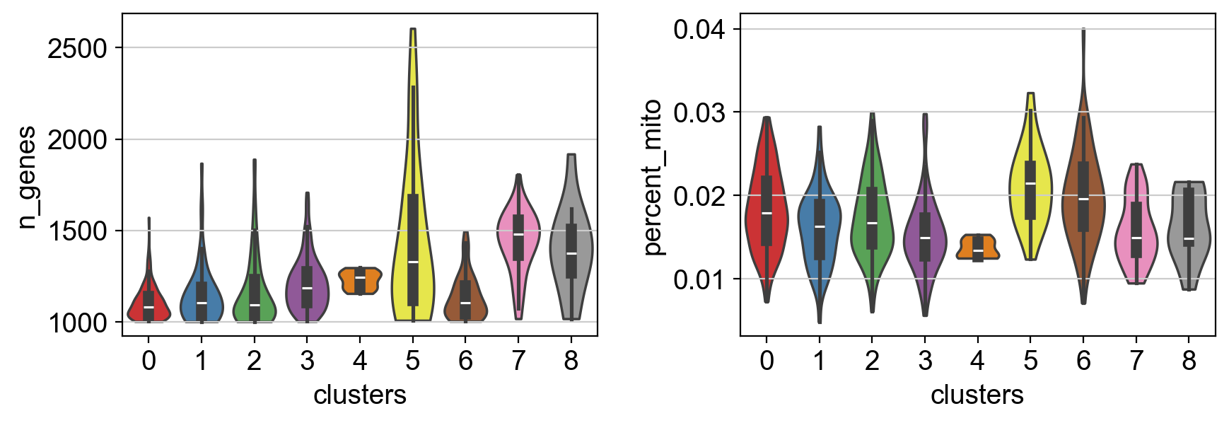 . For example, here violin plots are used to compare the number of genes and the percentage of mitochondrial genes between the different clusters.