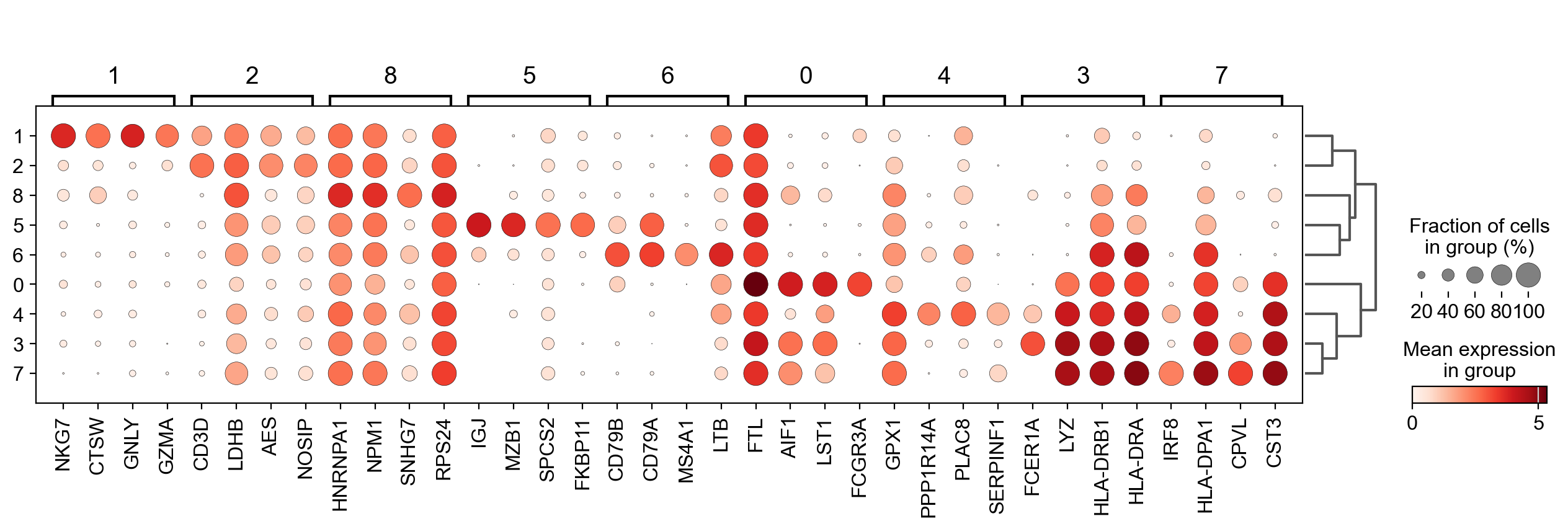 Next, we use a dotplot focusing only on two groups (the groups option is also available for violin, heatmap and matrix plots). Here, we set n_genes=30