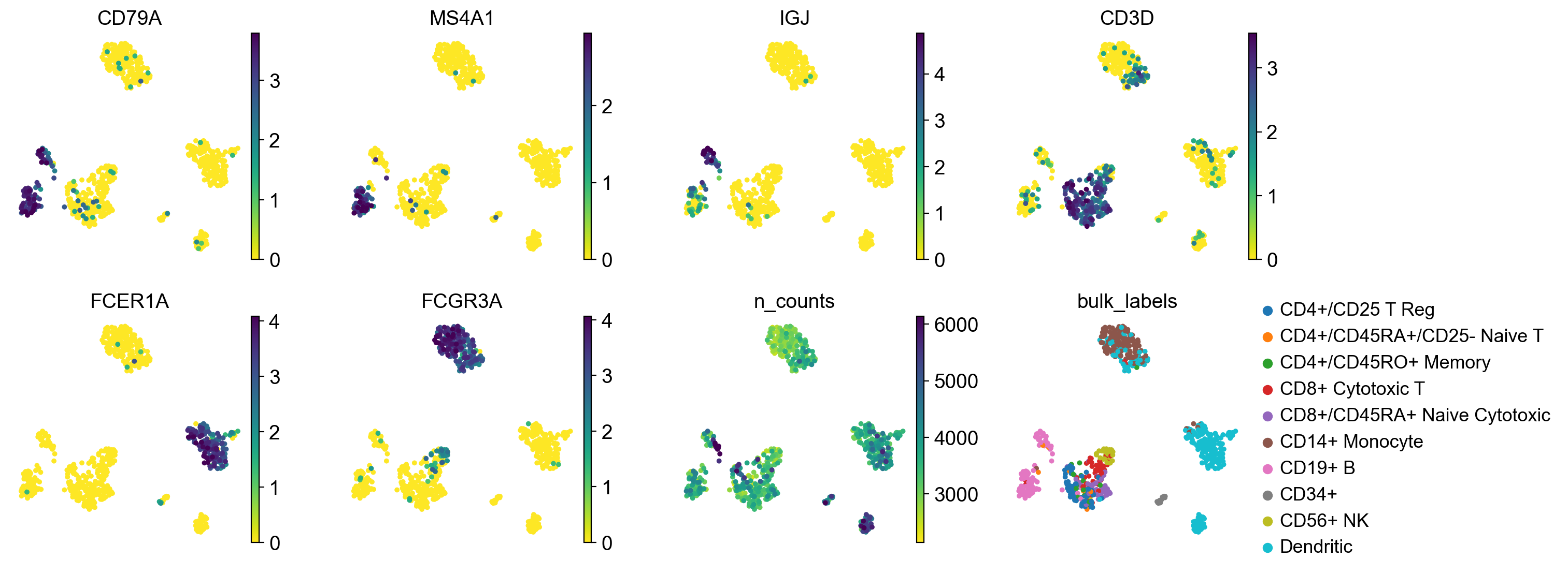 . In the following example we will plot 6 genes: ‘CD79A’, ‘MS4A1’, ‘IGJ’, CD3D’, ‘FCER1A’, and ‘FCGR3A’ to get an idea on where those marker genes are being expressed.